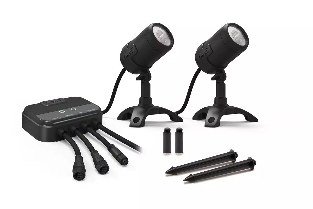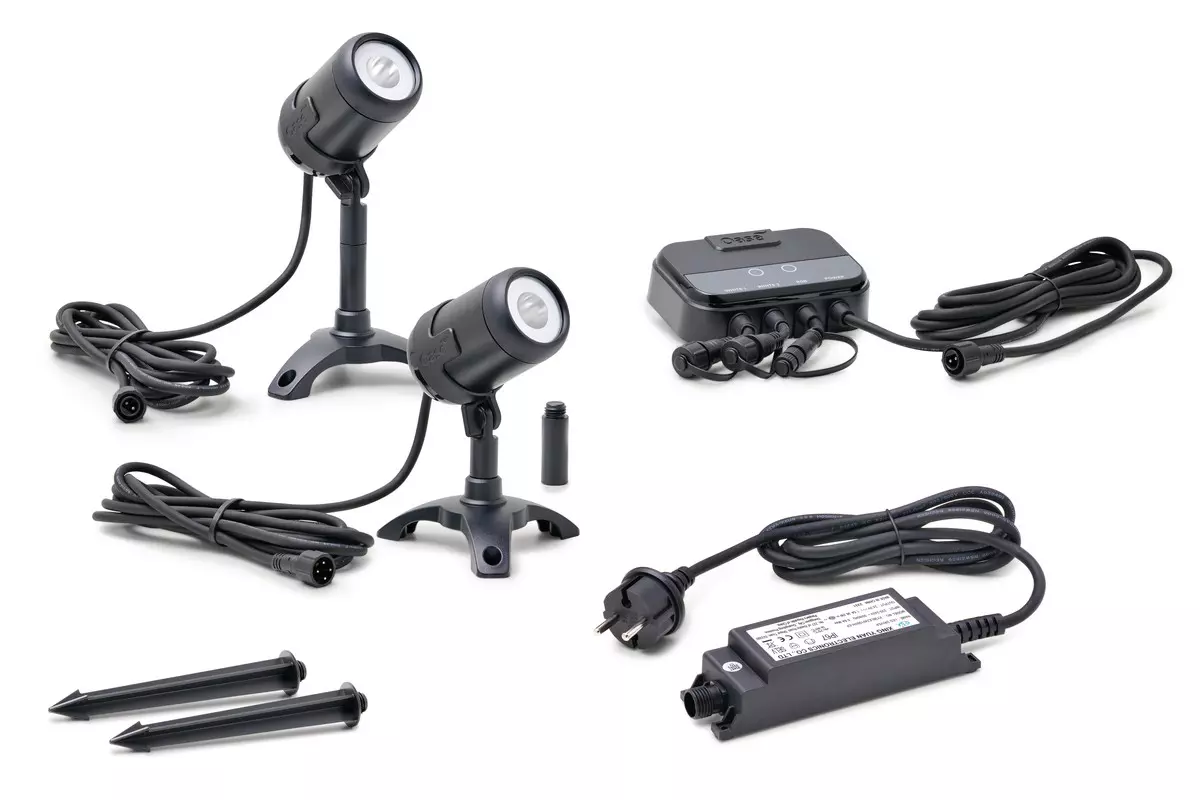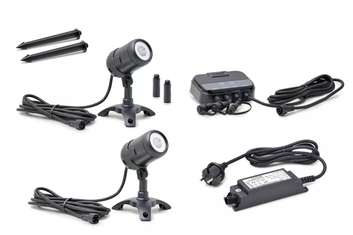 Komplettset aus 1 × Spot M weiss und 1 × Spot M RGB, einem OASE Switch Controller und einem 36 W Netzteil