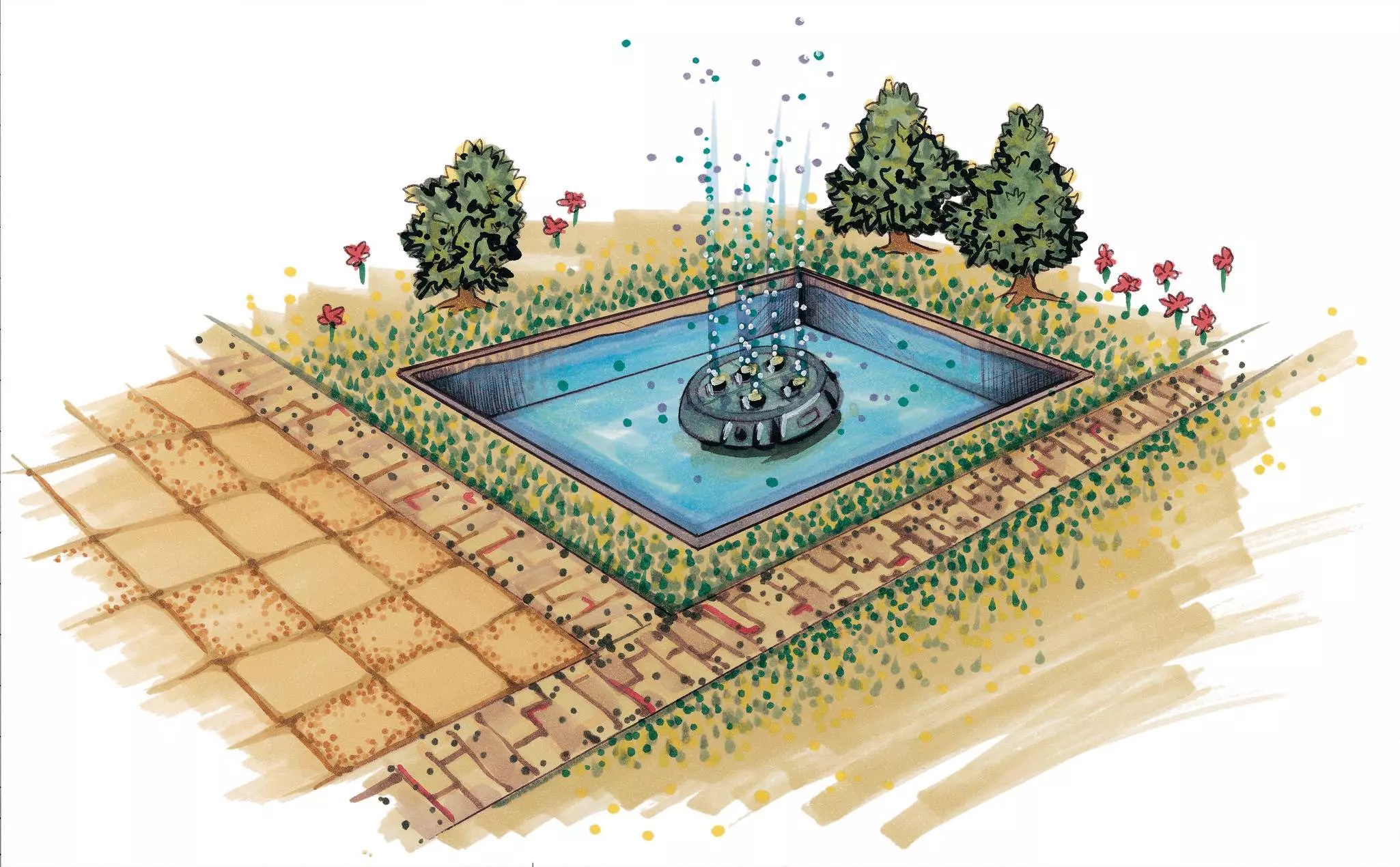 Fountain heights (30–140 cm) can be programmed to change automatically